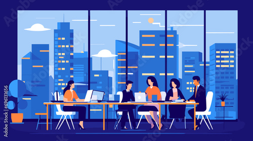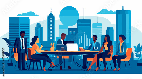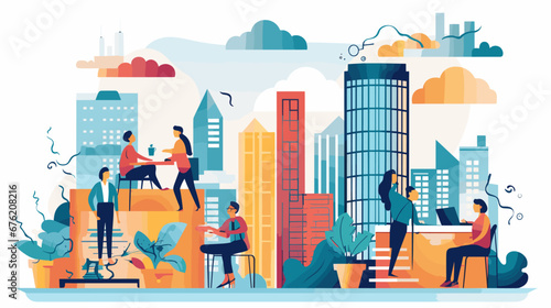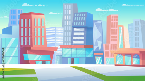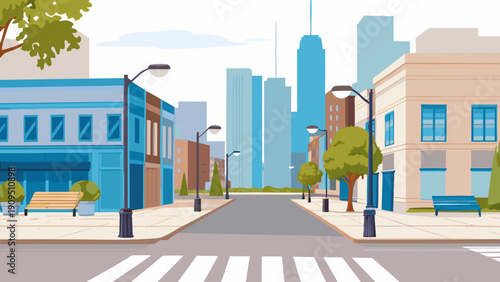 City scene set. People walk along the street, cross the road at pedestrian crossing on green light, roller skate, ride electric scooter, flat vector illustration. Pedestrian traffic.