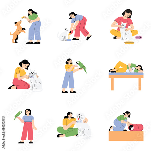People and different pets isolated vector set. Male and female owner characters holding, embracing and caring for dog, cat, fish, parrot, chameleon and python illustration