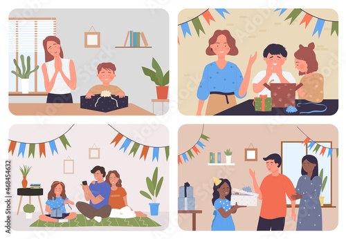 People and pets at home vector scene set. Man and woman caring cat, dog domestic animals and fish cartoon illustration. Male and female character feeding, playing and meeting nursling