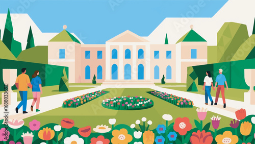 Vector illustration of happy couples walking together in the street. People and relations concept flat style design elements.