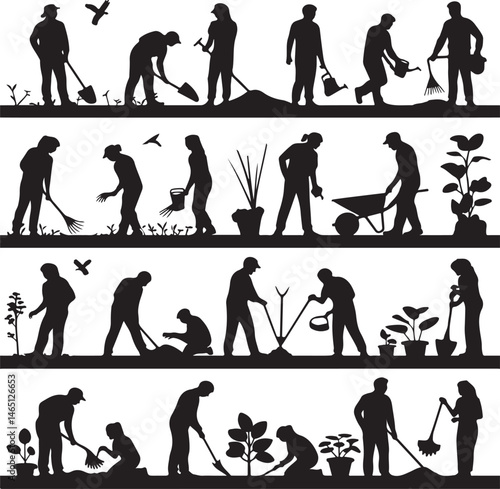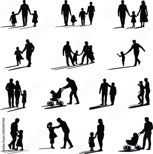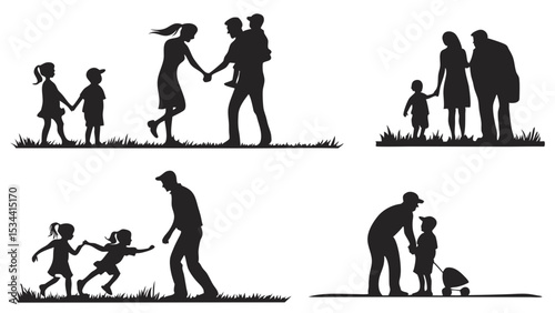 Active people characters at rope park entertainment balck-and-white silhouette isolated set. Children, parent and kids, adult couple, little friends having fun attraction outdoor adventure vector illustration