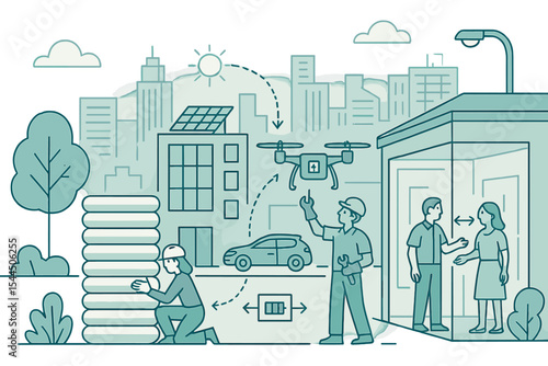 Man and woman charging cars at electric vehicle charging station, flat vector illustration. Ev charger, bicycle parking. Eco transport.
