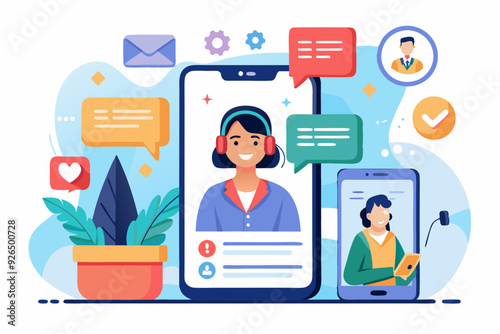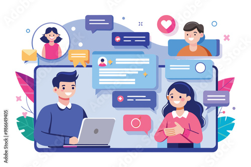 People chatting on social networks, flat vector isolated illustration. Instant messaging, sms and website chats, video messages. Digital communication.
