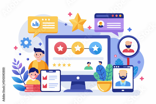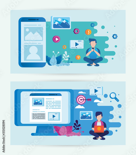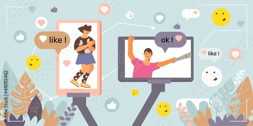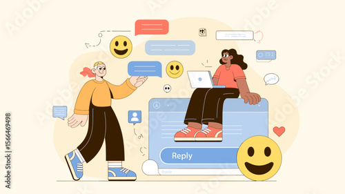 People chatting on social networks, flat vector isolated illustration. Digital communication. Online conversation. Social media.