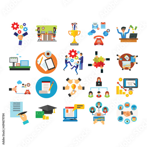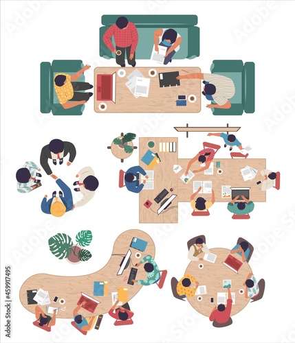 Group of business people discussing project startup, company strategy, vector flat top view illustration. Boardroom meeting, conference, brainstorm, teamwork, handshake.