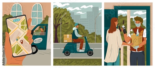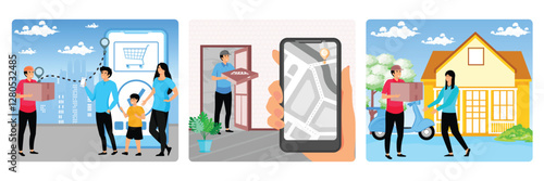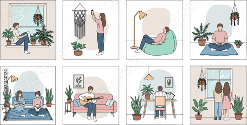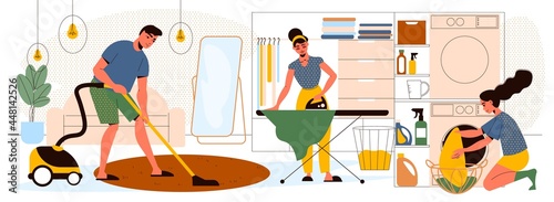 People doing housework and cleaning home. Vector set of posters with man vacuuming floor and woman wash dishes and clean window. Home interior, vacuum robot, people busy with cleaning household.