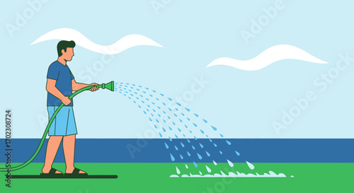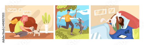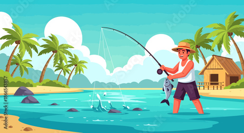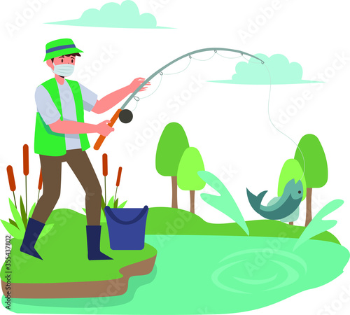 People fishing in pond, lake or river set. Young or adult single man, father and son catching fish with spinning rod vector illustration. Masculine hobby and recreation time