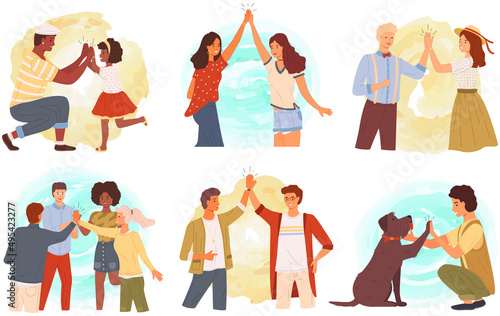 Happy people using ok and thumb up hand gestures while speaking, vector flat isolated illustration. Male and female characters expressing positive emotions and agreement. Consent and approval gestures