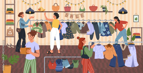 People in flower shop, flat vector illustration. Male, female characters selling buying cactus succulent plants, other decorative indoor plants in flower pots. Florist shop interior. Floral business.