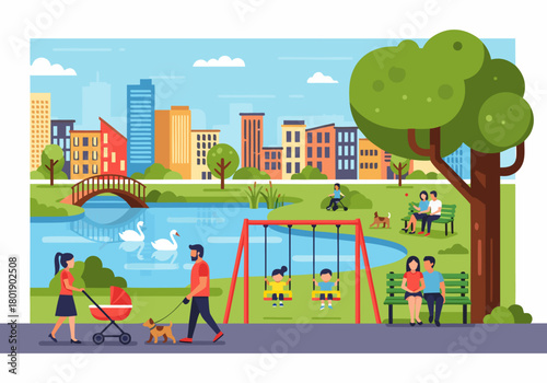 People in park concept banners vector set. Time with kids and friends in park. Vector illustration in flat style design. Man waiting for a public transport at bus stop. Couple sitting on a bench.