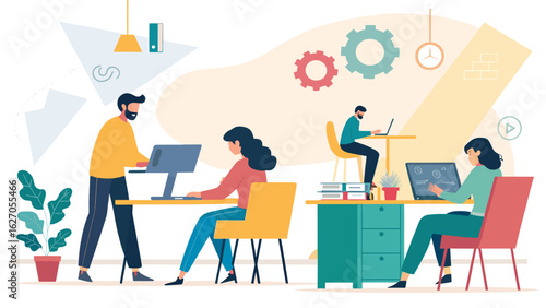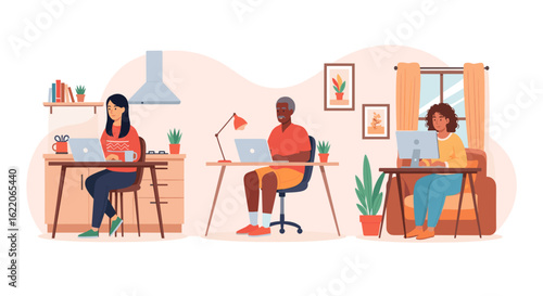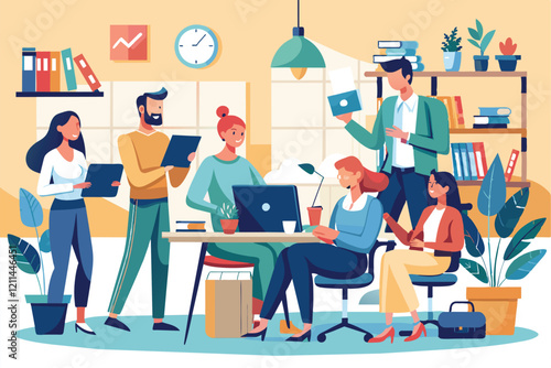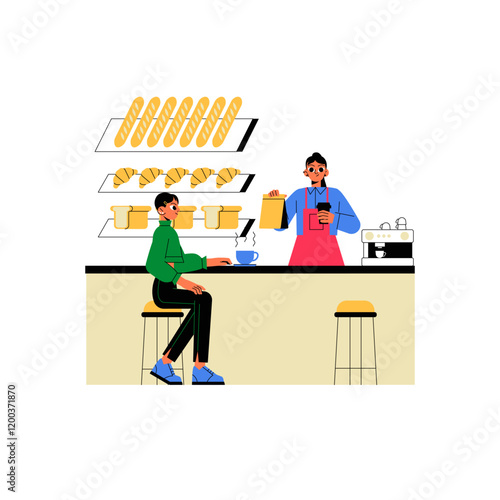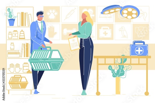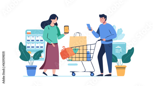 People in queue to cashier in grocery store or supermarket concept vector illustration. Customers buy fruits and vegetables. Woman with trolley waiting for checkout in grocery shop market.