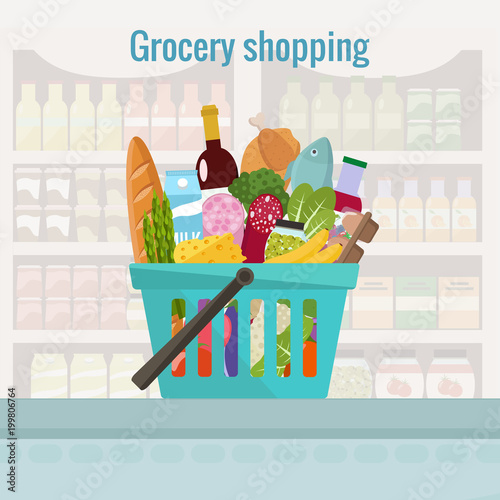 People keep distance in a line in grocery store. Social distancing and coronavirus covid-19 prevention. Concept illustration. Vector web site design template. Basket full of food products.