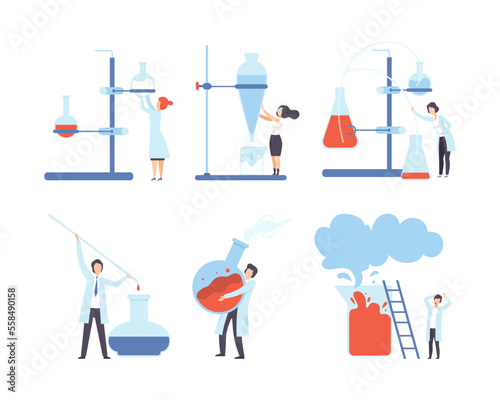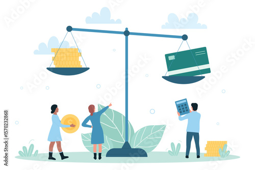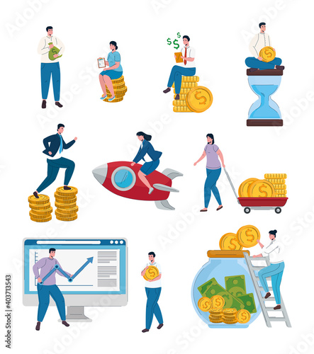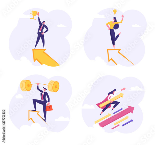 People looking to the future through telescope, binoculars while floating on boat, standing on mountain top, ladder, flat vector illustration. Future vision, business career, leadership.