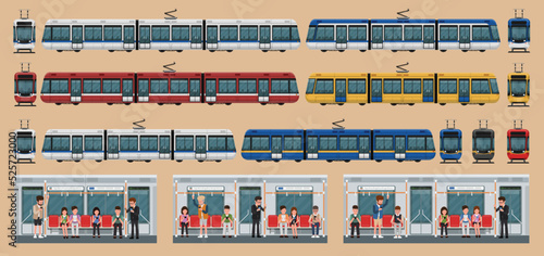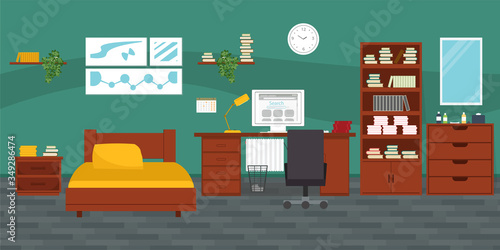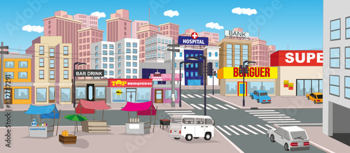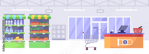 Vector illustration of grocery store or supermarket shelves, cashier, promoters advertizing products, buyers with shopping carts and baskets. People making purchases concept, flat style design.