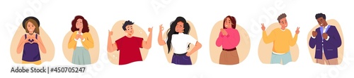 People closing eyes with hands and plugging ears with fingers, flat vector isolated illustration. Disregard, disagreement, refusal, denial, ignoring.