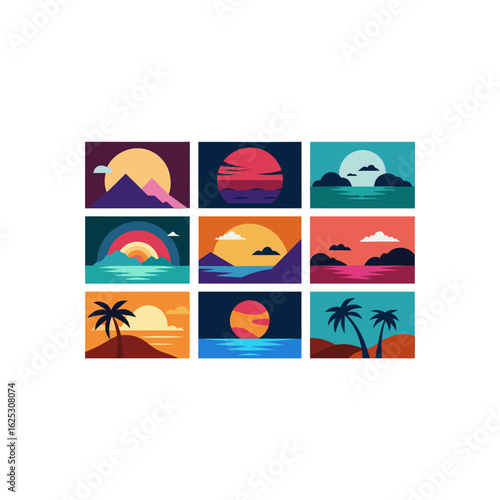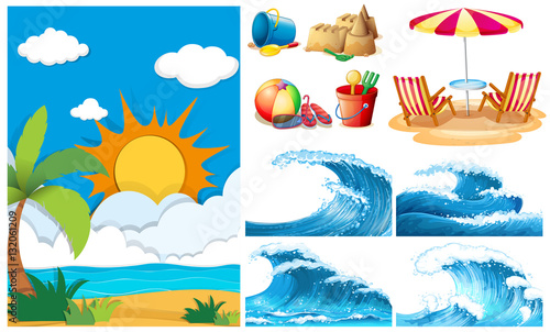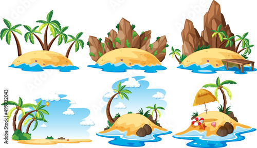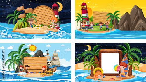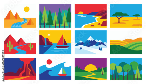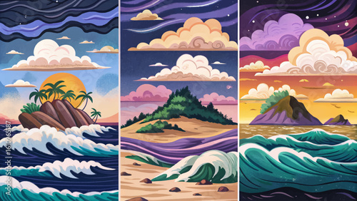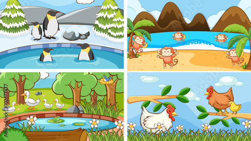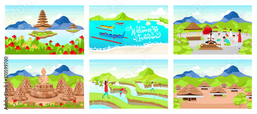 People on kayak rowing down to river. Water adventure sport vector posters set. Man and woman rafting, kayaking, canoeing, holding paddles. Camp with tent on lake beach.