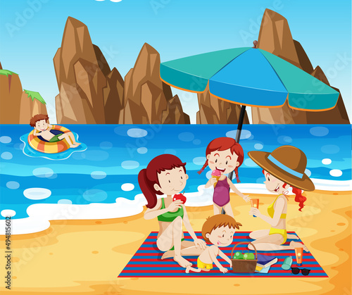 People relaxing on ocean beach, playing ball, riding water scooter, sunbathing under umbrella, flat vector illustration. Tropical vacation. Travel. Summer beach activities.