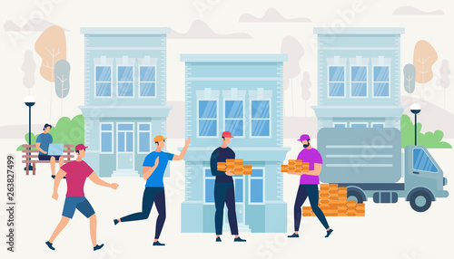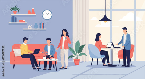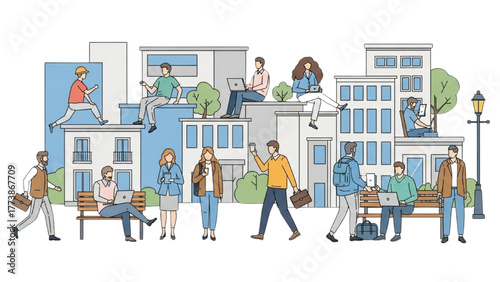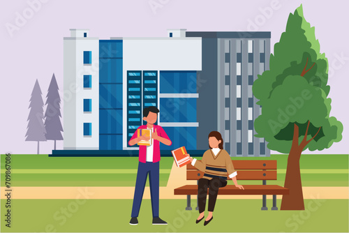 Happy people riding electric scooters, running in city park, flat vector illustration. Active and healthy lifestyle. Summer outdoor activity. Eco city transport.