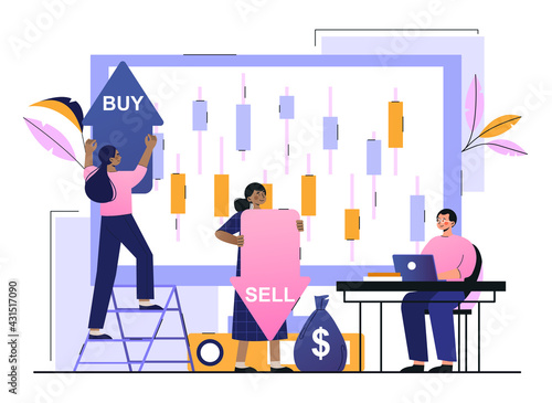 People in flower shop, flat vector illustration. Male and female characters selling fresh flower bouquets and cactus succulent plants, other potted houseplants. Floral business, florist service.
