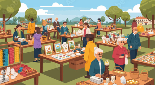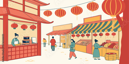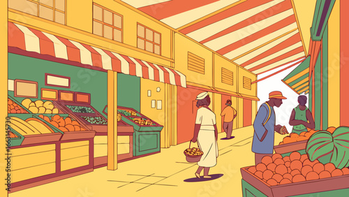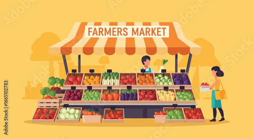 People shopping in grocery store or supermarket concept vector illustration. Organic shop with fruits and vegetables. Woman with trolley buying food. Shelves with food products and bakery.