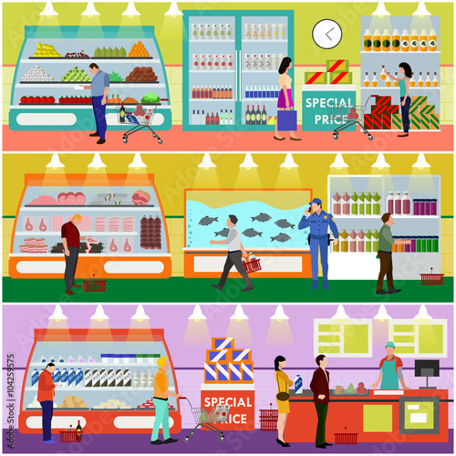 People shopping in grocery store or supermarket concept vector illustration set. Shop with organic fruits and vegetables. Man with basket buying food. Store cashier, shelves with food products.