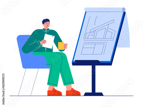 Vector illustration of buyer male with shopping basket full of groceries. People shopping flat style design element, icon isolated on white background.