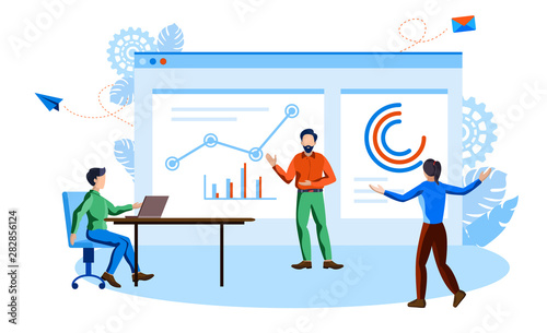 Vector illustration of woman with her son sitting in shopping cart full of groceries. People shopping flat style design element, icon isolated on white background.