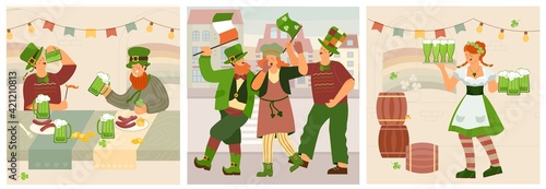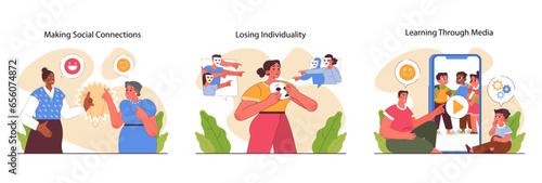 People sort trash for recycle concept vector posters set. Family separate grabage in different waste bin. Plastic bottle, organic waste, paper, glass.