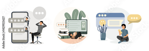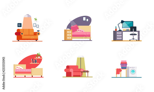 People spending free time at home, flat vector illustration. Male and female characters working, cooking, meditating, reading, watching tv. Sport, hobby and leisure activities. Everyday home routine.