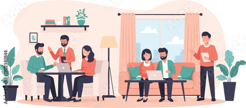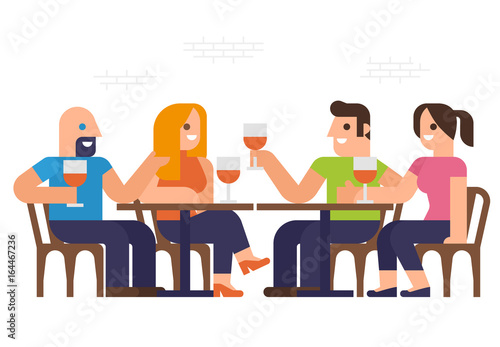 People visiting cafe, vector flat illustration. Happy male and female characters best friends meeting in cafe, restaurant, bar, beer pub. People talking, drinking wine, beer and having fun.