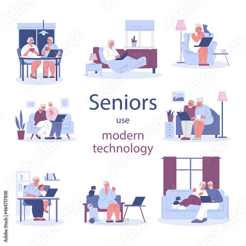 Male and female cartoon characters working, surfing the net using laptop computers at home, in office, cafe and in the park, vector flat illustration isolated on white background.