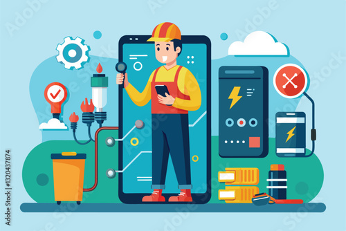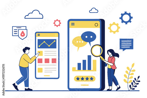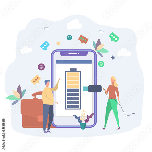Micro male and female characters using huge smartphone with mobile app icons on screen, vector illustration. People using gadgets of modern technology concept for web banner, website page etc.