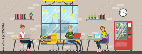 People visiting coffeehouse, cafe, bakery, walking down pedestrian shopping street, flat vector illustration. Small street shop exterior with customers. Public place, shopping business.