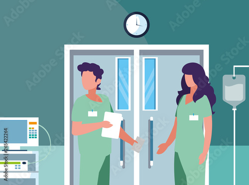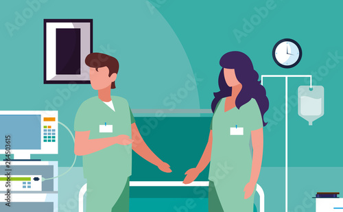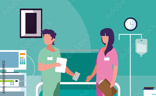 Vector illustration of temporarily disabled people visiting doctor. Man with broken leg using crutches and woman with broken arm in plaster. Flat style design.