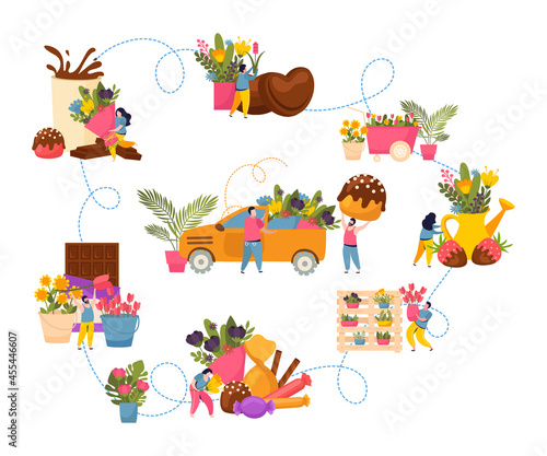 Perfume set, flat vector isolated illustration. Different perfume bottles with heart, gift box, balloon, text. Seasonal and holiday sale and discounts promo banners for perfume store.