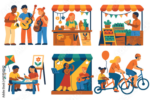 Pet owner with dog going shopping, visiting restaurant or bakery shop scene. Man and woman with friendly puppy domestic animal spending time together vector illustration. Dog-friendly places