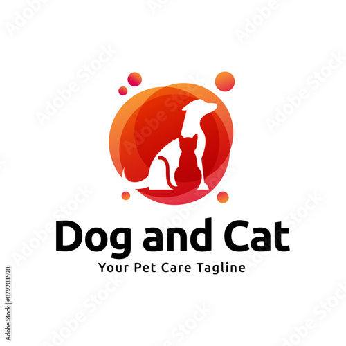 Pets shop logo design template. Vector paper art illustration of red paw print and dog, cat and parrot silhouettes in it.