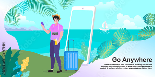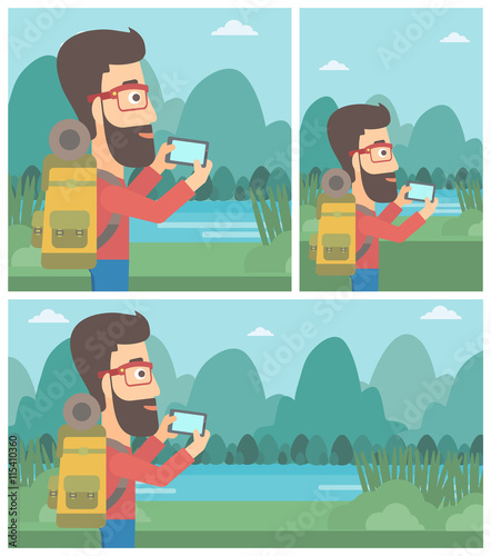 Photographer landing page design, website banner template set, flat vector illustration. Woman taking photo of nature with camera. Professional photography equipment. Creative profession or hobby.
