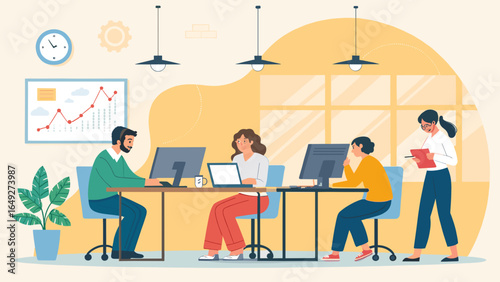 Photographer shooting young girl model, celebrity and mens apparel with professional camera in studio, flat vector illustration. Photographer profession. Photoshoot.