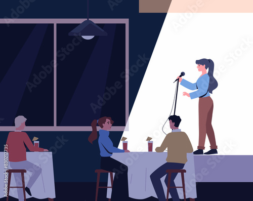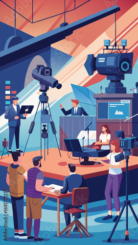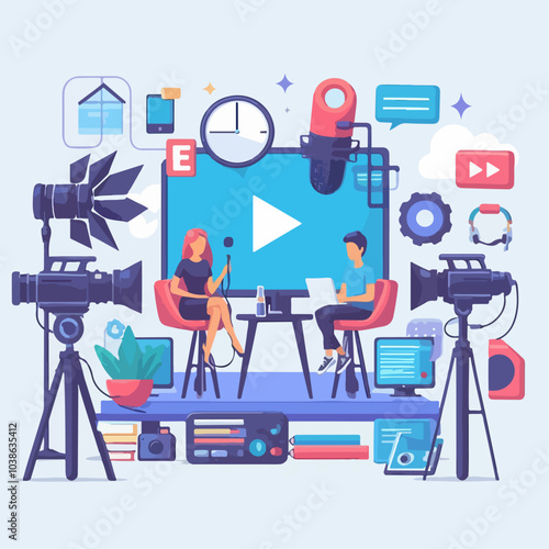 Photographer shooting young girl and cute pet dog with professional camera in studio, flat vector illustration. Photographer profession. Photoshoot.