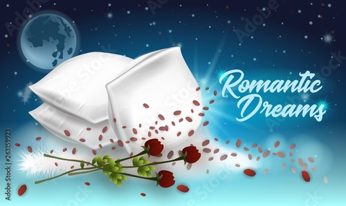 Sweet dreams concept vector realistic illustration. White pillows on moonlit sky background. Soft comfy pillows ad design template.