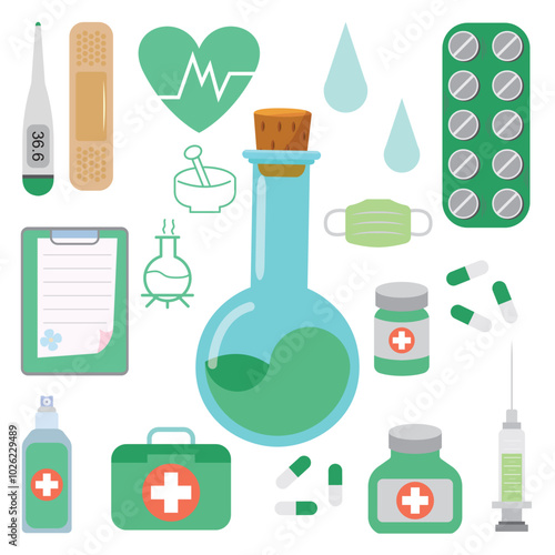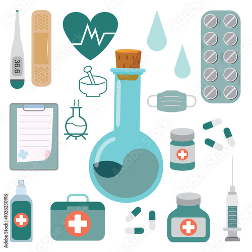 Pills in blister and bottle, liquid drugs with shield medical vector poster. Antibiotic pharmaceutical protection illustration