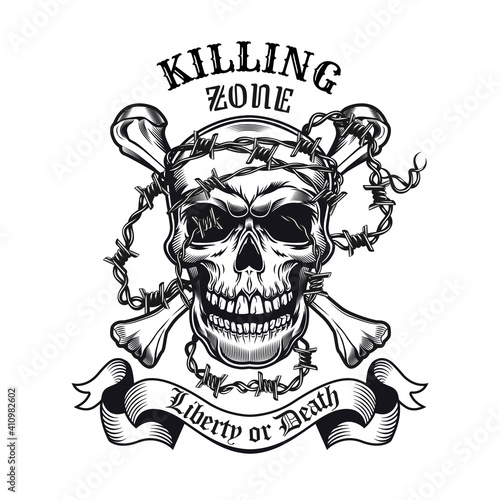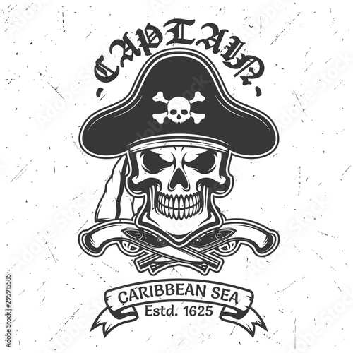Pirate captain skull and crossed swords vector sketch grunge illustration. Human skull wearing pirate hat and eyepatch. Vintage logo, tattoo template design.