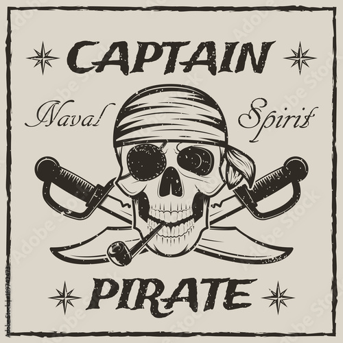Pirate captain skull and crossbones. Vector sketch grunge illustration of human skull wearing bandana and eyepatch with smoking pipe. Vintage logo, tattoo template design.