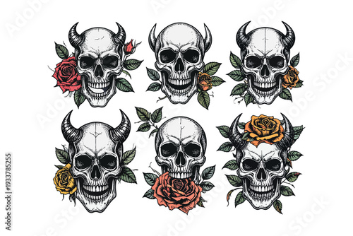 Pirate skull set, vector hand drawn illustration isolated on white background. Human skull with crossed swords and bones, wearing pirate captain hat, bandana, eyepatch. Vintage tattoo t-shirt graphics