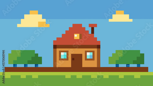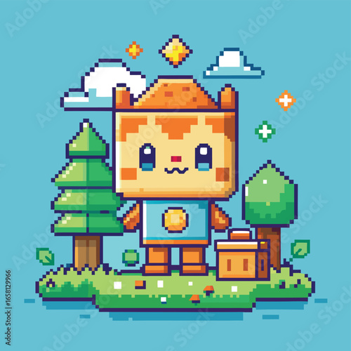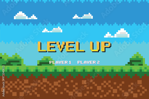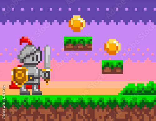Pixel art style western video game vector template. Old wild west shooter game design with sheriff and native american indian characters shooting each other.