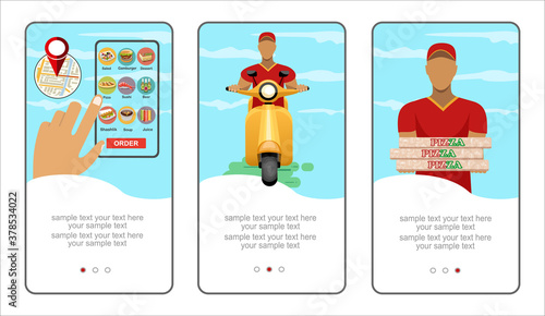 Pizza order, delivery and tasting mobile app onboarding screens. Menu banner vector template for website and application development. Pizza online order with delivery service.