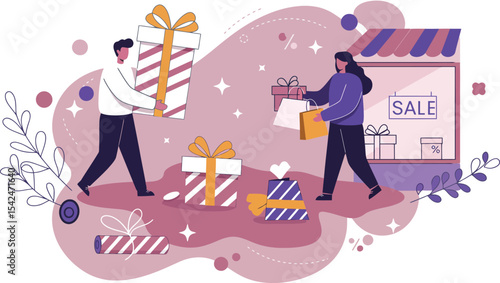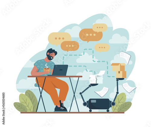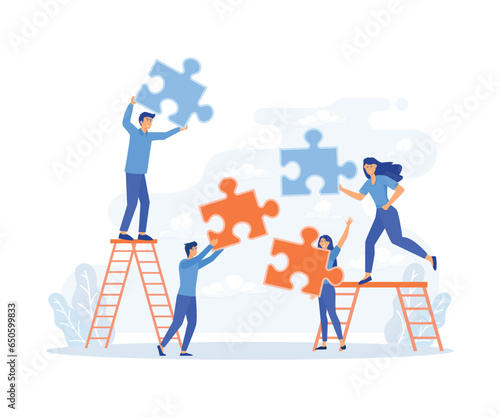 Micro male characters making huge delicious burger or bun with ground beef patty, cheese, ketchup, vector illustration. Fast food restaurant business composition for web banner, website page etc.