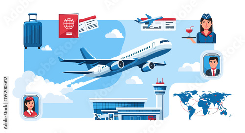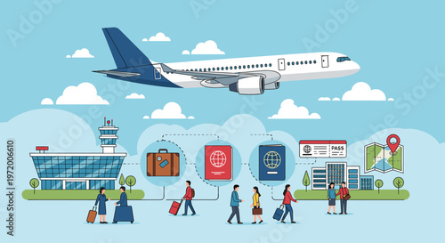 Plan your travel infographic guide. Vacation booking concept. Vector illustration in flat style design. Hotel and air tickets booking, visa, landmarks icons.