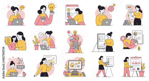 Planetarium, space museum scene set, flat vector illustration. People looking at night sky, solar system planets, stars, celestial bodies through telescope, listening to guide. Astronomy education.